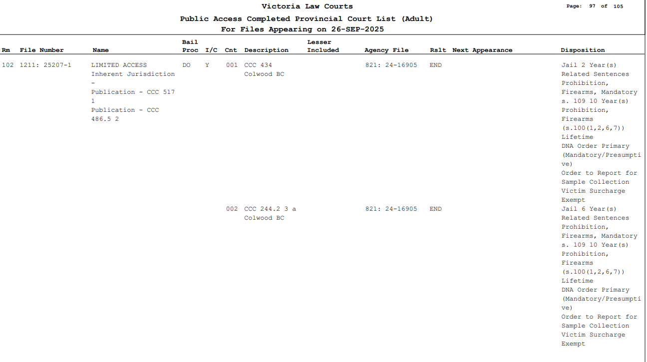 Mark Caillou made a court appearance on September 26 where he was charged with theft, disguise with intent, resisting or obstruction of a peace officer, possession of a firearm or weapon contrary to order, storage of a firearm contrary to regulations and unauthorized possession of a prohibited or restricted weapon. Mark Caillou was remanded in custody with his next appearance scheduled for October 6, 2025.