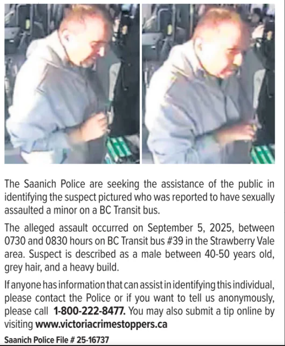On October 6, 2025, just after 2 p.m., the Saanich Police received a report of a robbery at a business in the 3700 block of Quadra St. The report indicated that a male had entered a store, produced an edged weapon and demanded money. The suspect fled with an undisclosed amount of cash.