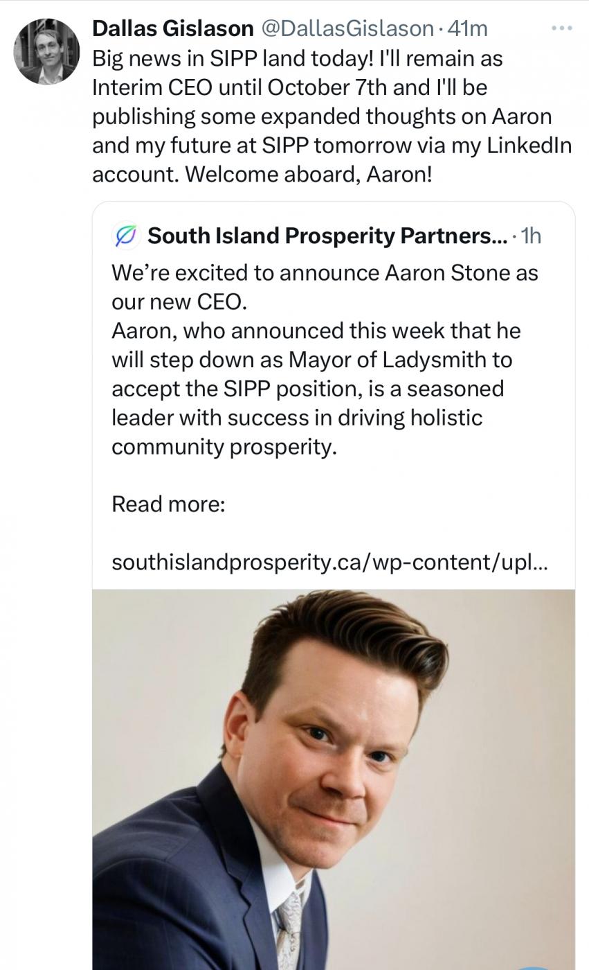 This is straight out of left field. Mayor of Ladysmith will be heading to Victoria to lead SIPP.